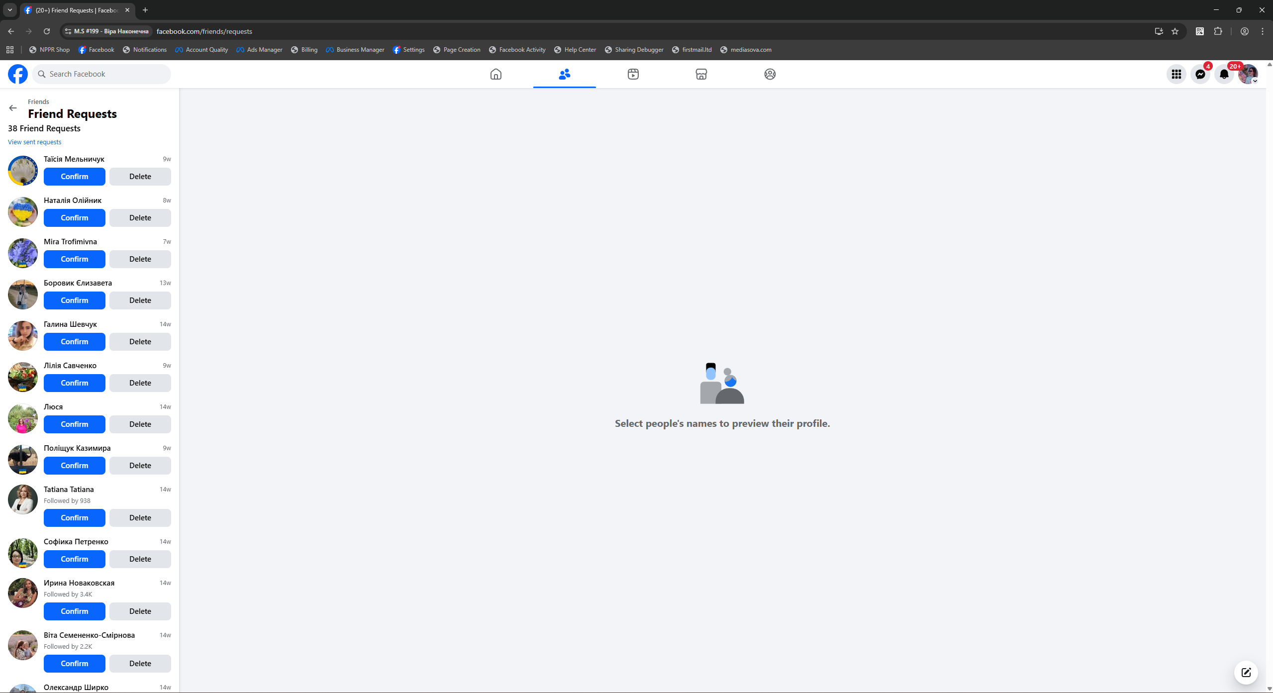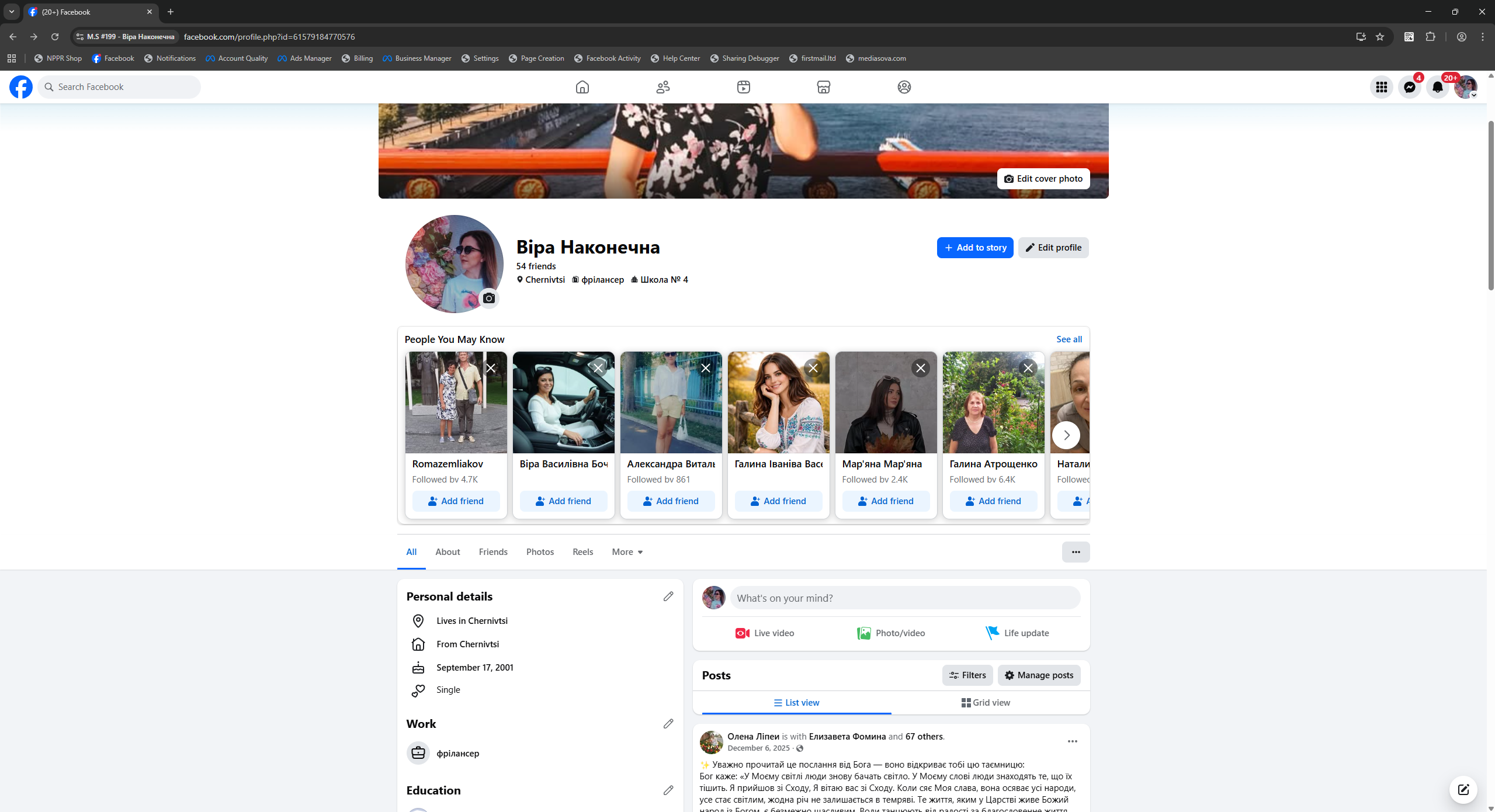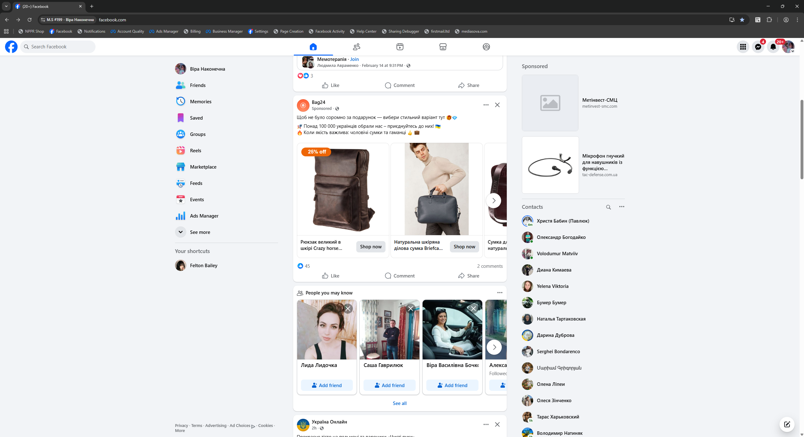 Facebook accounts registered in Ukraine with mobile IPs and 90-day preparation. All profiles are female gender, with Latin names, confirmed email, and enabled 2FA. Each account has 50+ friends (mostly from Ukraine), developed advertising interests, created new-design Fan Page (FP), and demonstrated consistent user-like activity both on and off the platform.
