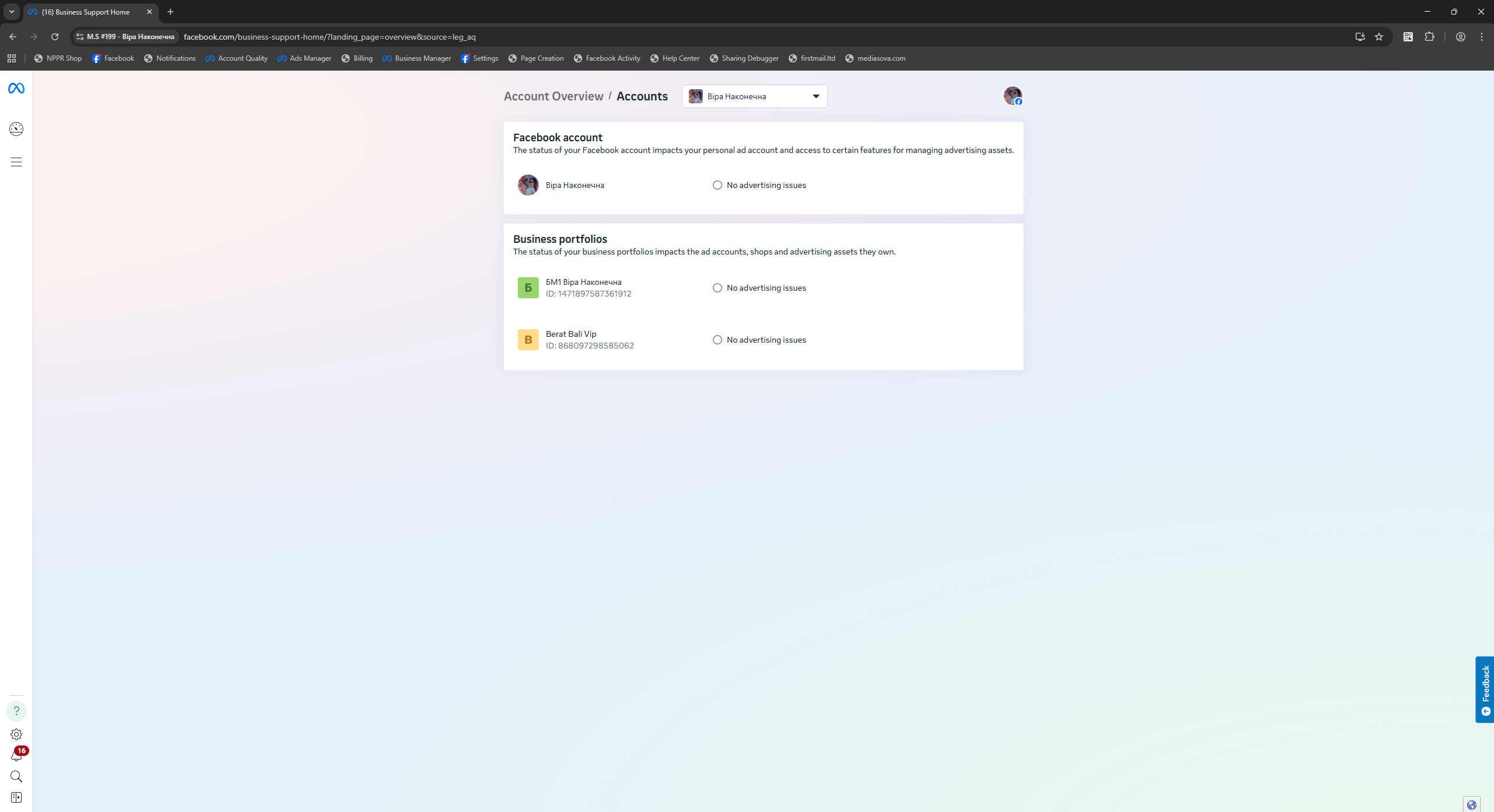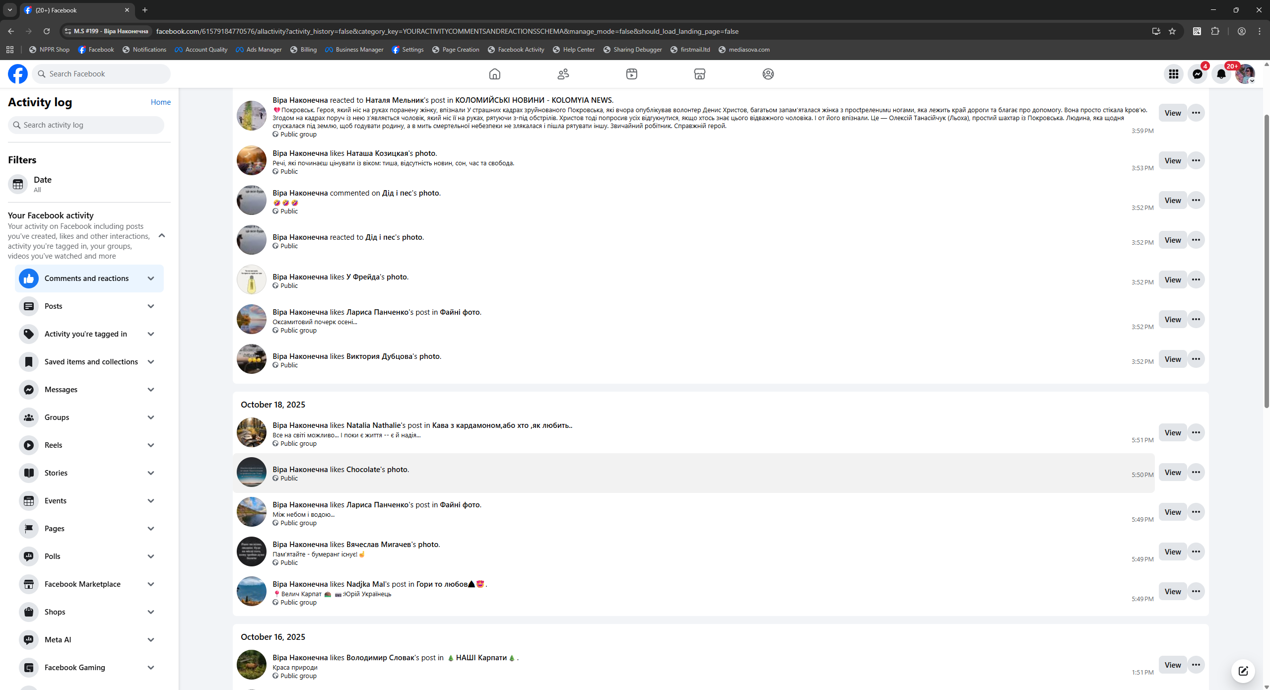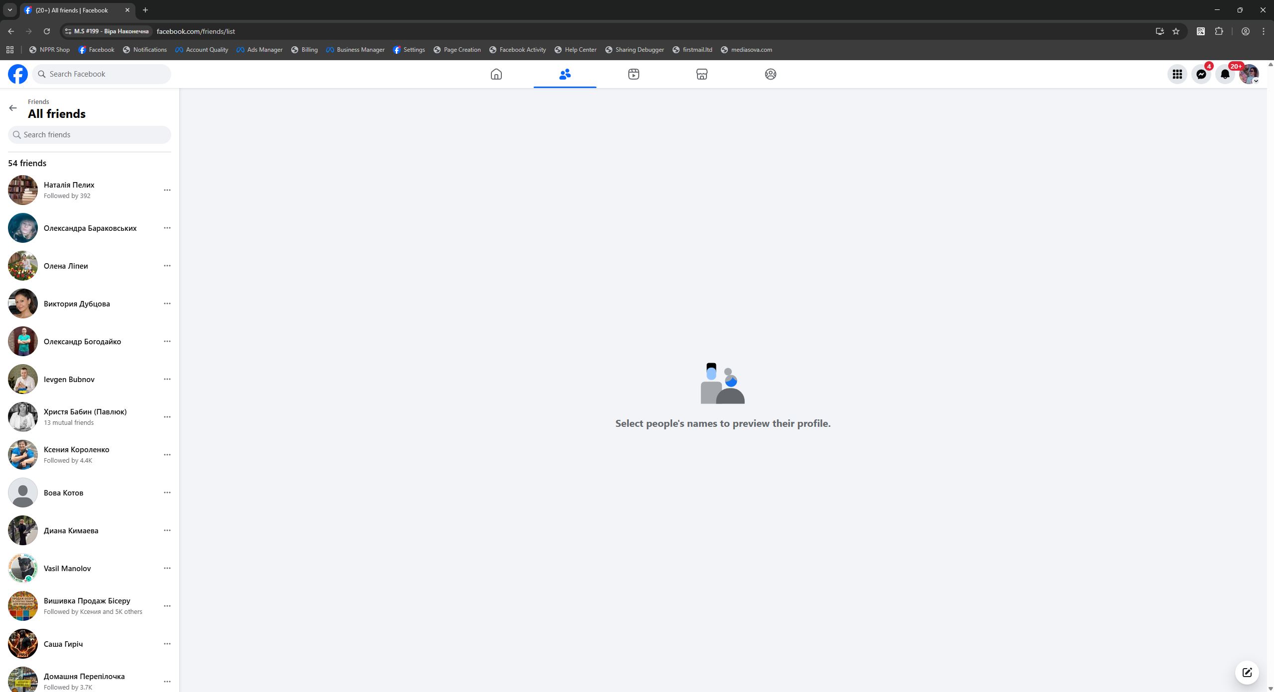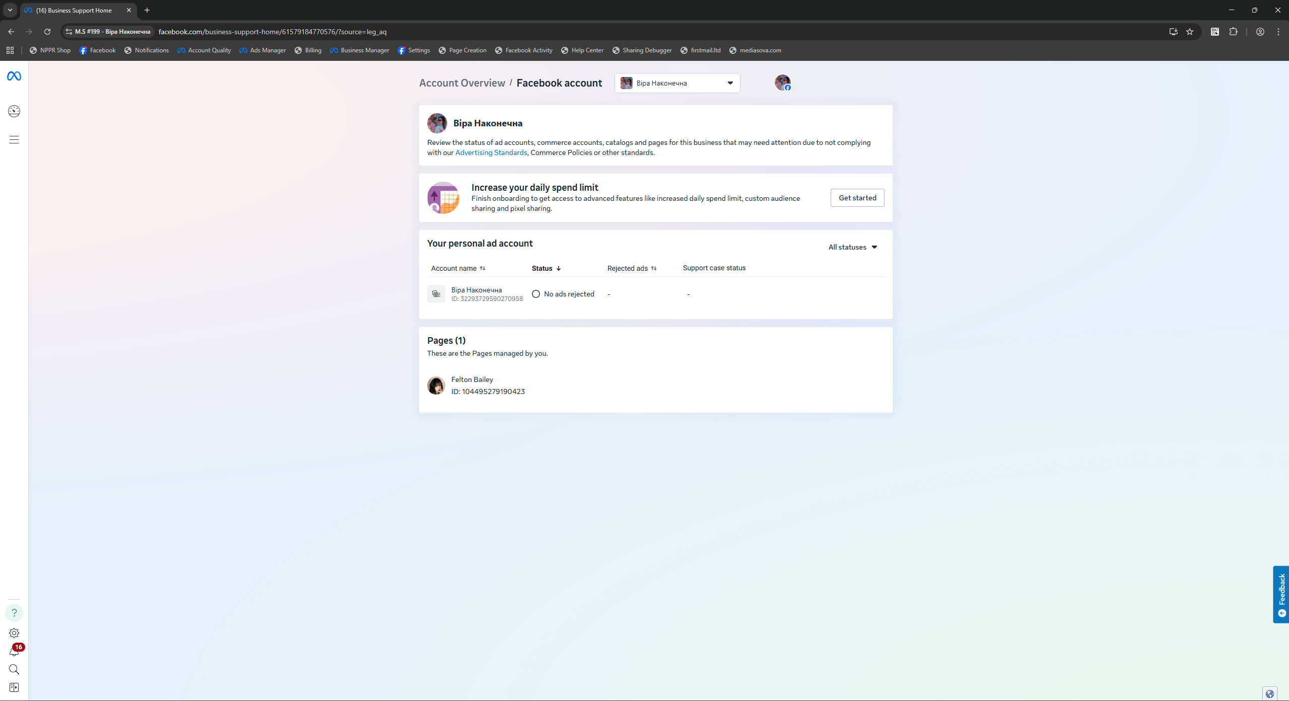 Facebook accounts registered in Ukraine with mobile IPs and 90-day preparation. All profiles are female gender, with Latin names, confirmed email, and enabled 2FA. Each account has 50+ friends (mostly from Ukraine), developed advertising interests, created new-design Fan Page (FP), and demonstrated consistent user-like activity both on and off the platform.